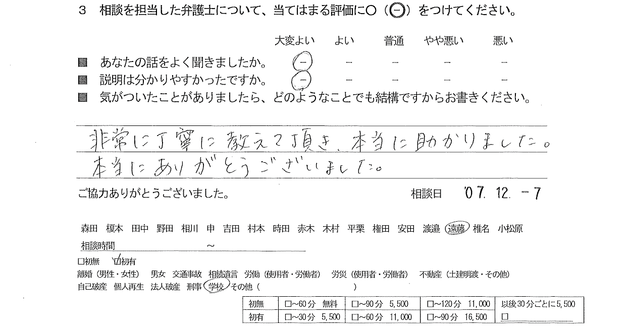 お客様の声(ご相談者の声)評判・口コミ 公開日:2026/01/14 お客様の声 ご相談者の声 ■年代 ■担当弁護士 ■あなたの話をよく聞きましたか ■説明はわかりやすかったですか - 遠藤 吏恭 大変よい 大変よい 非常に丁寧に教えて頂き、本当に助かりました。 本当にありがとうございました。 「お客様の声(ご相談者の声)評判・口コミ」 「お客様の声(ご相談者の声)評判・口コミ」